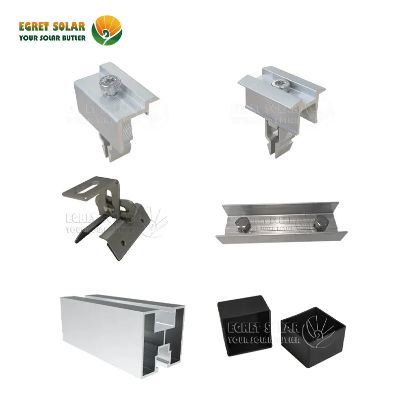 Ця система в основному складається з сонячного хатину X, алюмінієвого профілю 40x40 мм, швидкого кінцевого затискача, швидкого роз'єму середнього затискача та залізниці. Довжина залізниці може бути розширена залізничним з'єднувачем. Щоб добре захистити всю цю регульовану систему даху сонячного металу, ви можете додати кінцеву кришку.